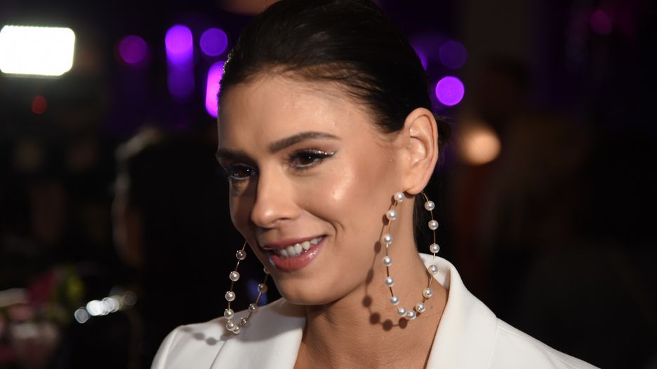 Klaudia Halejcio postawiła na biały garnitur. Całość dopieściła złotą bluzką, która mieniła się w blasku fleszy.