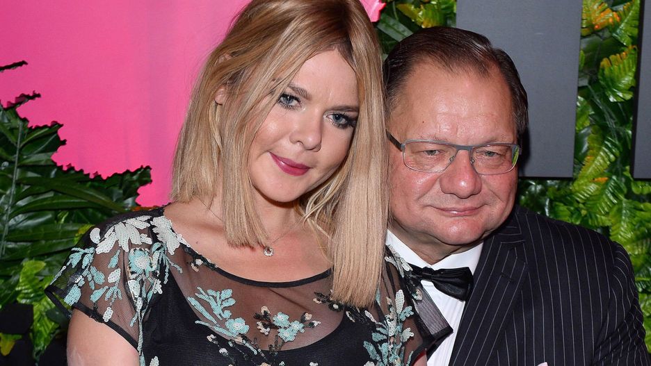 Ryszard Kalisz z młodziutką żoną pozuje na ściance. Dzieli ich 29 lat